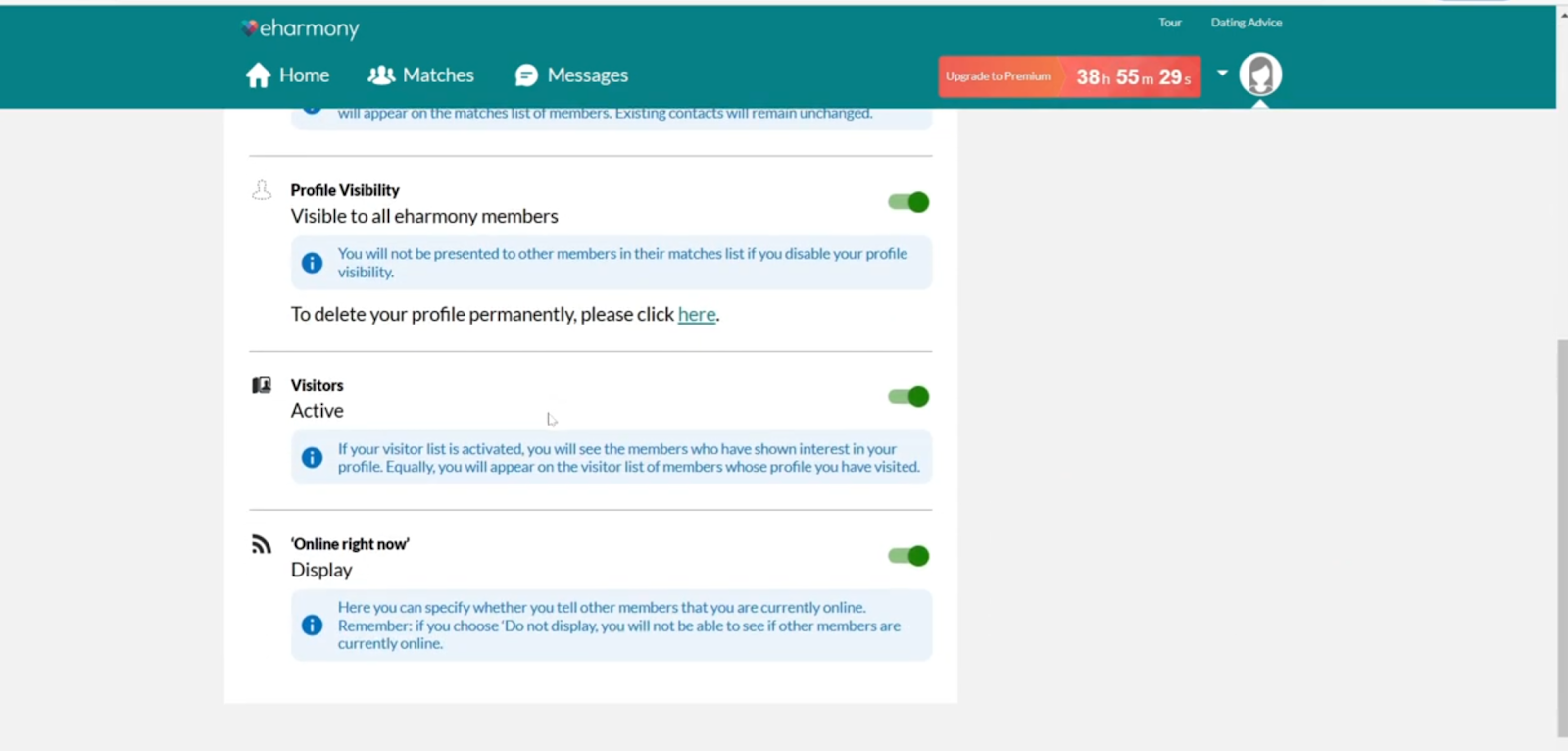 Instead of complete deletion, eHarmony offers the option to "hide" your profile. It makes you invisible to other users while preserving your account information in case you wish to return in the future.