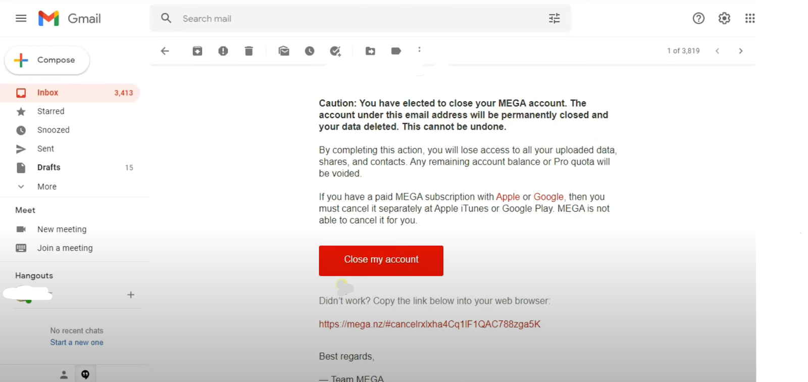This guarantees that all of your data is removed from MEGA's servers. But if you permanently delete your account, all of your saved files and folders will vanish as well.