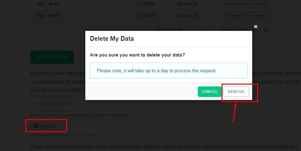Step 6: Scroll down and select the opt-out option. A notification will pop up, and click remove.