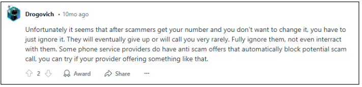 Try not to answer unknown phone calls or respond to shaky messages. Instead, block unknown callers through a built-in feature on your phone or through apps.